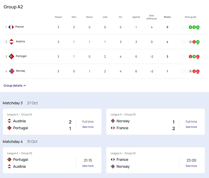 Австрия впервые выиграла в этой Лиге наций – у Португалии. Первый гол выдался комичным: Ана Сейса при выносе мяча попала в спину Катарине Амаду, и мяч залетел в собственные ворота. Вскоре Барбра Дунст дальним ударом удвоила преимущество австриек. На последних секундах Татьяна Пинту отыграла один гол, но было уже поздно. Теперь Австрия вторая в квартете.
