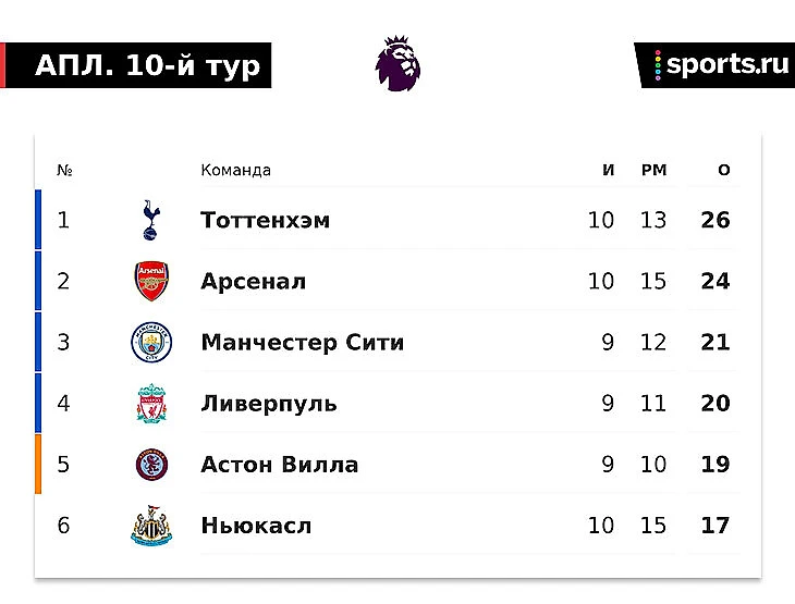 Погоня за «Тоттенхэмом» в самом разгаре. Оба лондонских клуба еще не проигрывали. У «Арсенала» семь побед в десяти матчах, у «шпор» – на одну победу и два очка больше. Снизу поджимают «Ман Сити» и «Ливерпуль».