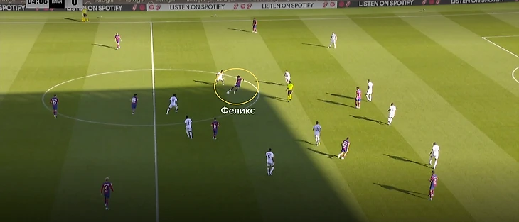 В опорной зоне располагались Гюндоган и Гави. Феликс смещался в полуфланг. По левому краю поднимался Бальде. Справа ширину создавал Канселу.