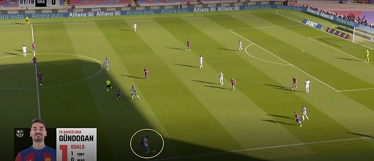 Первый гол пришёл после неслаженных действий игроков «Мадрида». Гюндоган попытался сыграть в стеночку с Ферраном, но после рикошета от Тчуамени мяч направляется в штрафную. Но здесь сразу три футболиста гостей не решили, кто должен идти на мяч. Гюндоган воспользовался неуверенностью в действиях соперника, ускорился и забил первый гол.
