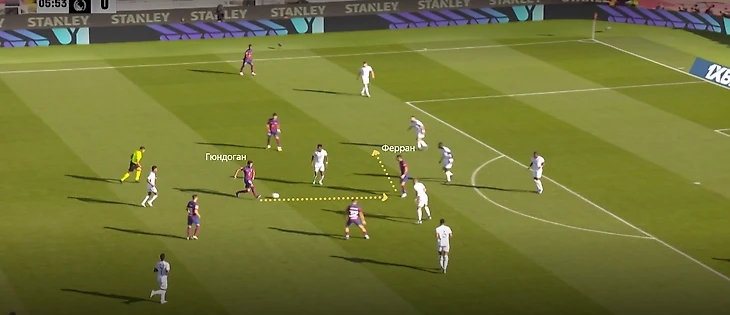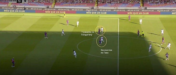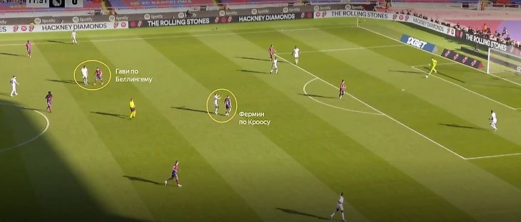 Следующий важный ход Анчелотти – персональные ориентировки. Беллингем часто действовал по Гави, а Тчуамени – по Гюндогану. Кроос зачастую оказывался рядом с Фермином.