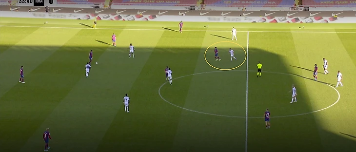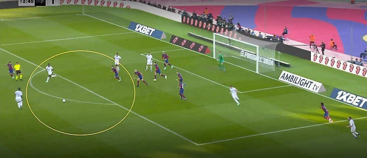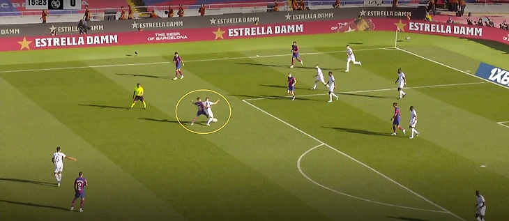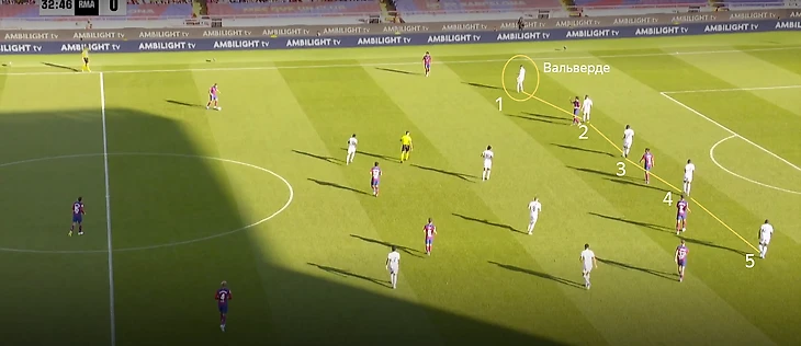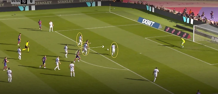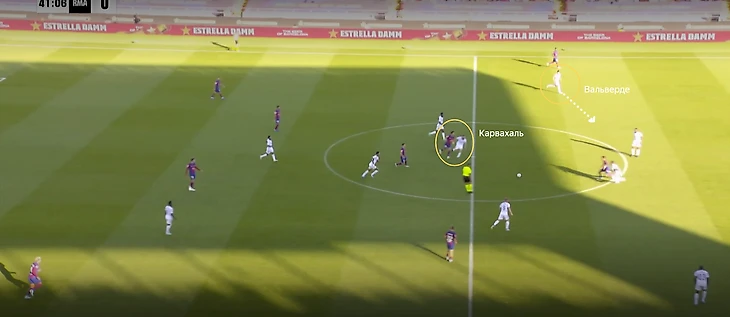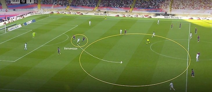С мячом у «Барселоны» образовывалась пятёрка в атакующей линии, поэтому Анчелотти ожидаемо дал указание Вальверде опускаться пятым футболистом в линию защиты.