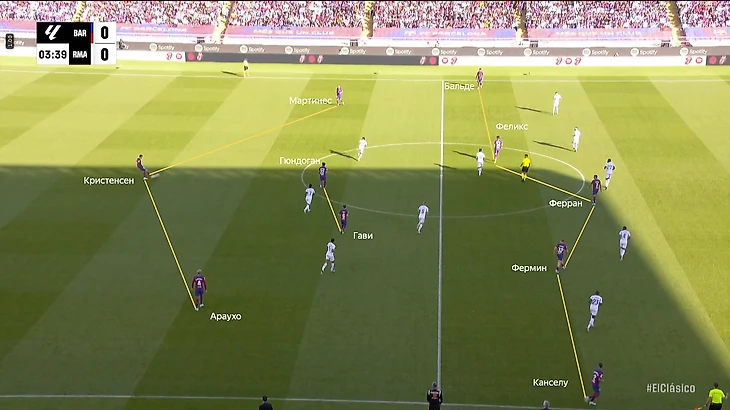 Структура «Барселоны» позволяла контролировать мяч. Для создания опасности у чужих ворот каталонцы постоянно пытались расшатывать защиту «Мадрида». Феликс постоянно смещался в глубину.