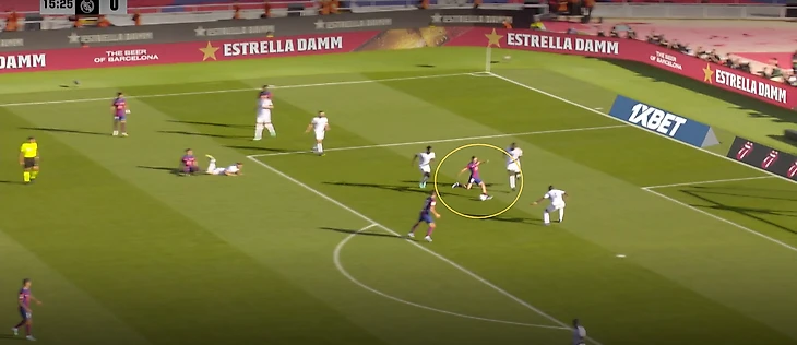 Вот отличный пример. Торрес отвлёк внимание Алабы, а Фермин Лопес сразу же вбежал в образовавшееся пространство.