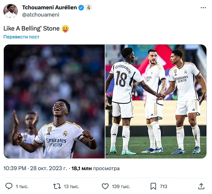 Тчуамени написал в Твиттере: «Like a Belling’ Stone 😛», прикрепив фотографию, на которой он и Беллингем пожимают друг другу руки.