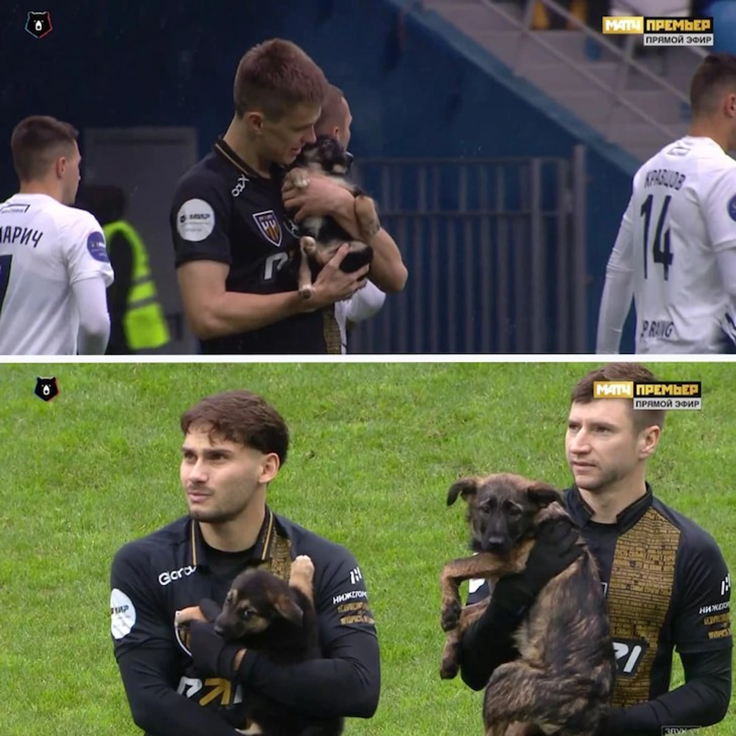 Футболисты вышли на игру с песиками из приюта «Сострадание». На игре был устроен сбор пожертвований для помощи приюту.