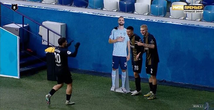 После гола Калинский с партнерами сразу же разделили радость с картонным Гоцуком. Защитник «Пари НН» пропускал матч из-за дисквалификации, но своеобразно присутствовал на игре в виде картонной фигуры. «Это наш кэп. Мы же обещали, что он будет на поле», – написал клуб в соцсетях.