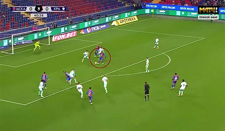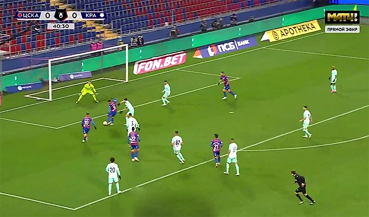 ЦСКА повел на 41-й минуте: Аббосбек Файзуллаев закинул в штрафную, Федор Чалов прокинул мяч первым касанием, легко избавился от опеки Хуниора Алонсо.
