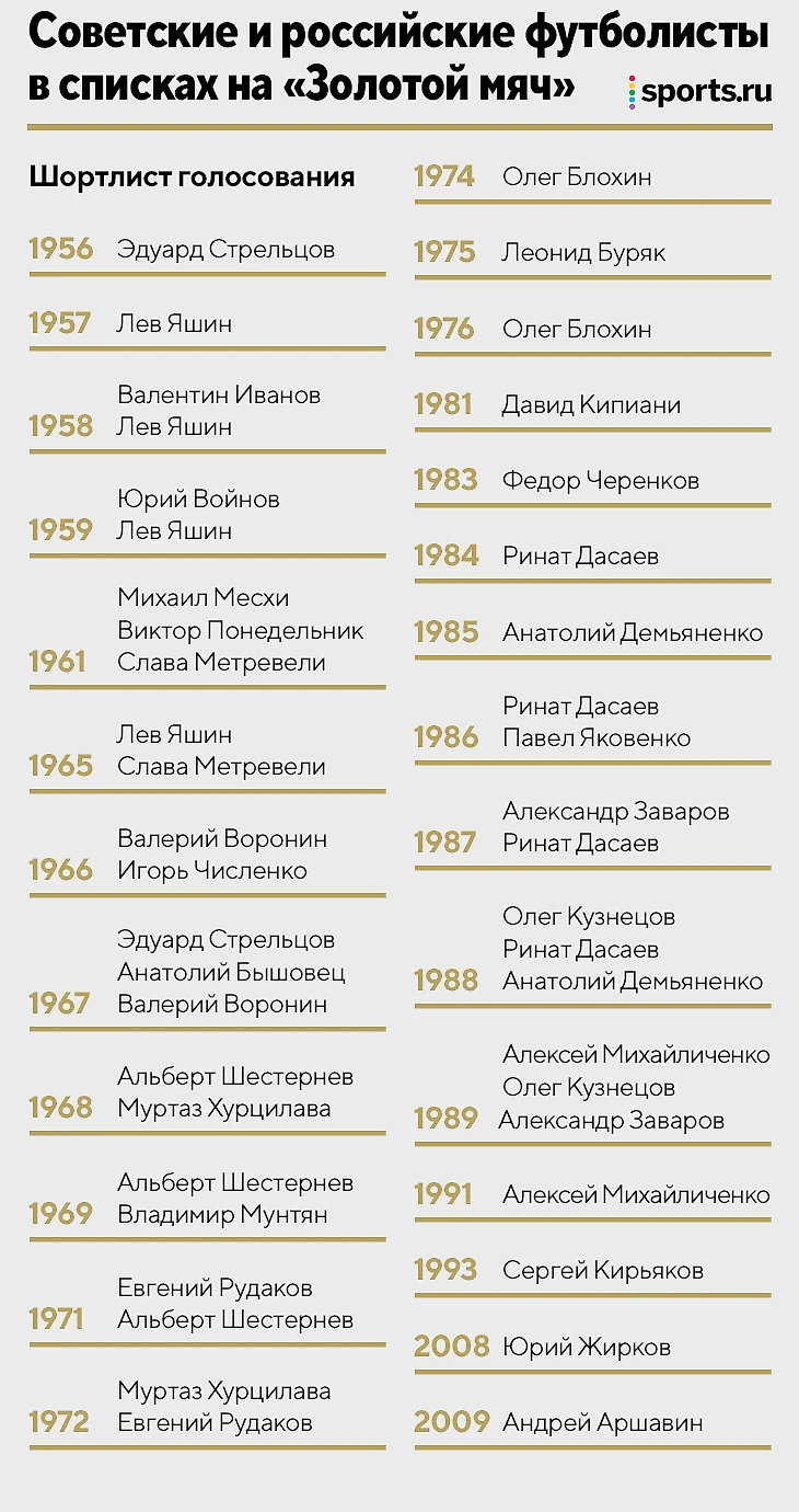 К шортлистам «Золотого мяча» без россиян мы привыкли давно: с 2009-го списки без российских футболистов. Когда-то все было иначе: с 1956 года (первого вручения) всего семь розыгрышей «ЗМ» обходились без представителей СССР.