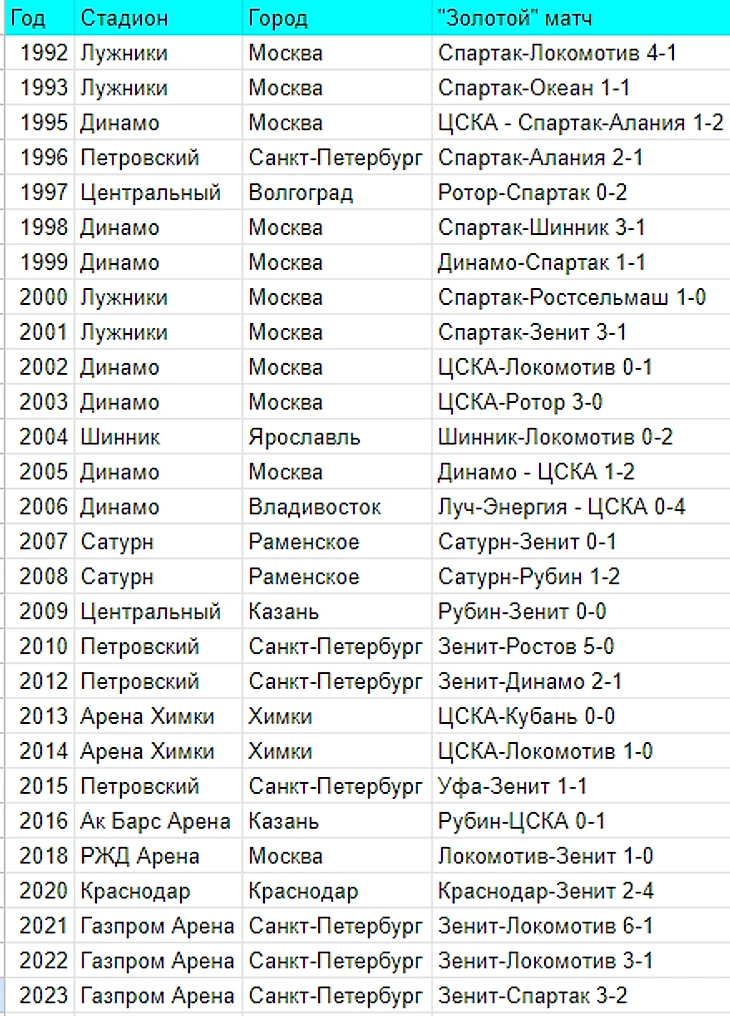 За 31 розыгрыш чемпионата России по футболу состоялось 28 «золотых» матчей (поединков после которых определился чемпион). Трижды встреч такого неофициального статуса не было по следующим причинам:
