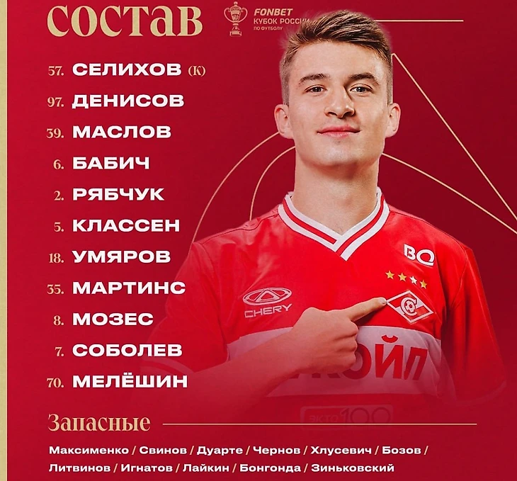 Состав московского «Спартака» на домашний матч 6-го тура группового этапа Пути РПЛ Кубка России против «Краснодара»