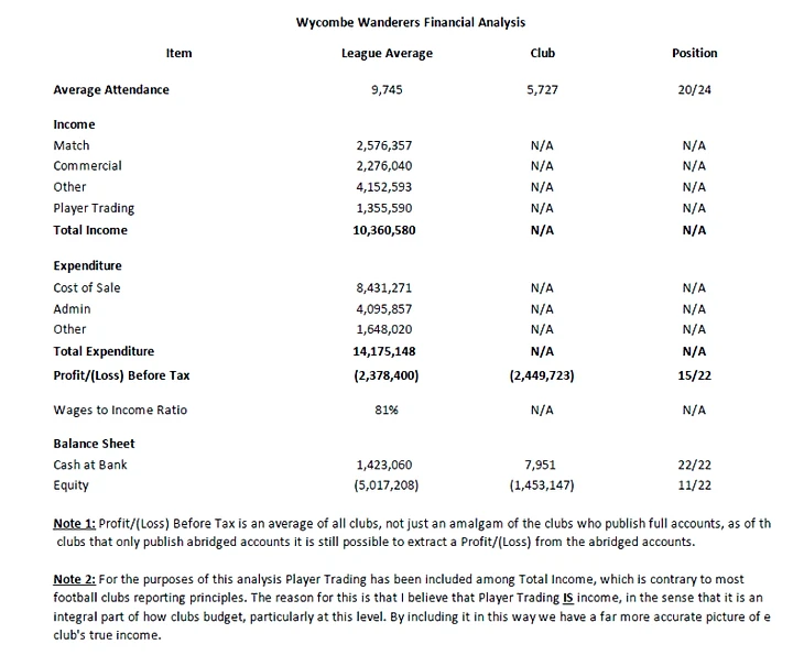 Обычно я начинаю анализировать текущие финансовые положения соперников, каждый раз используя один и тот же набор данных для сравнения каждого клуба, который затем представлен в таблице, которую вы обычно видите ниже. Большая часть этой информации, хотя и не вся, взята из отчетов соответствующих клубов, опубликованных в Регистрационной палате. Если вы сейчас посмотрите на таблицу, вы увидите символы N/A, встречающиеся почти в каждой категории. В данном случае это означает «Недоступно», поскольку Уикомб публикует только самые краткие из отчетов, практически без дополнительной информации в них. Они широко известны как «Счета малых компаний», что я особенно нахожу уместным, когда речь идет о соседях Оксфорда по шоссе М40, поскольку это прекрасно характеризует их менталитет. Кажется, у них на плечах есть постоянная проблема (особенно когда дело касается противостояния с Юнайтед), своего рода синдром «маленького человека».