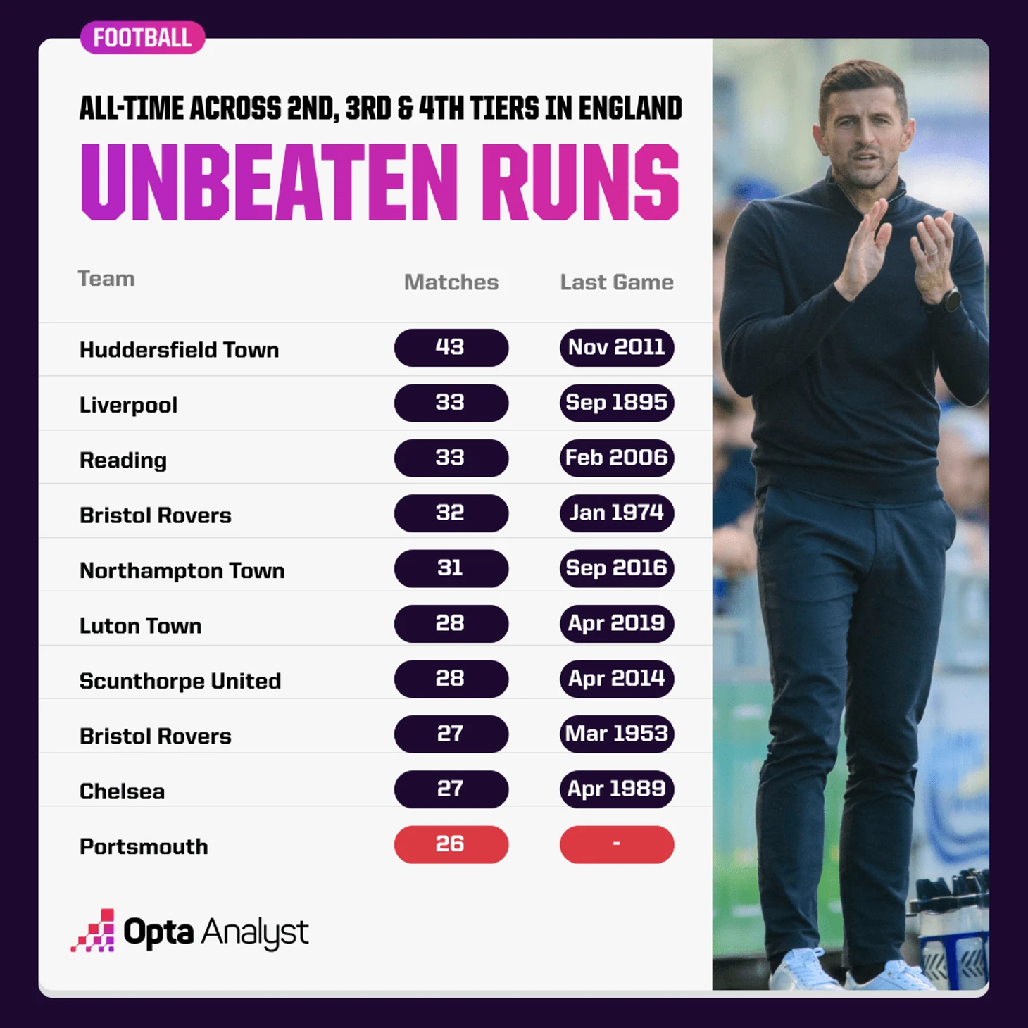 Примечательно то, что серия из 15 матчей без поражений покорялась лишь шести клубам в Лиге 1, и только половина из них по итогам сезона вышла во второй футбольный дивизион Англии. Последней командой, не проигравшей 15 матчей на старте, был «Шрусбери» в сезоне 2017/18, однако, «землеройки» заняли 3-е место и проиграли в финале плей-офф «Ротерему». У «Портсмута» пока получается идти по пути легендарного «Бристоль Роверс» образца сезона 1973/74 – «пираты» с начала сезона выдали серию из 27 игр без поражений (15 побед и 12 ничьих), но в конечном итоге проиграли свою 28-ю игру, что не помешало им заработать повышение по итогам сезона.
