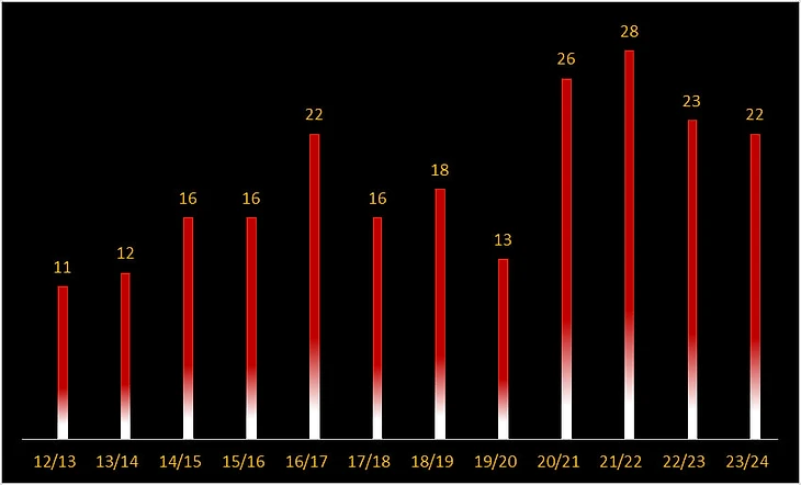 Одновременно с этим, добытое количество очков по итогам 10-ти туров текущего турнира Серии А (см. диаграмму), пусть на минимальное значение, но является наименьшим под началом Пиоли. Разница невелика и сыграно-то всего ничего. Но бросается в глаза разве что феноменальный чемпионский сезон 2021/22, в котором «Милан» по итогам первой декады матчей набрал 28 очков.