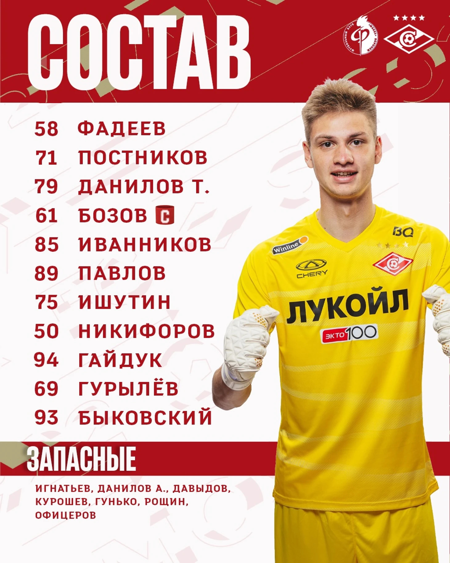 «Спартак»: Фадеев, Постников, Бозов (к), Т. Данилов (Давыдов, 88), Иванников (Курошев, 63) Ишутин (Гунько, 88), Павлов (Рощин, 72), Никифоров, Гайдук (Офицеров, 80), Гурылёв (А. Данилов, 88), Быковский.