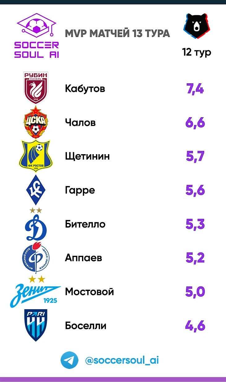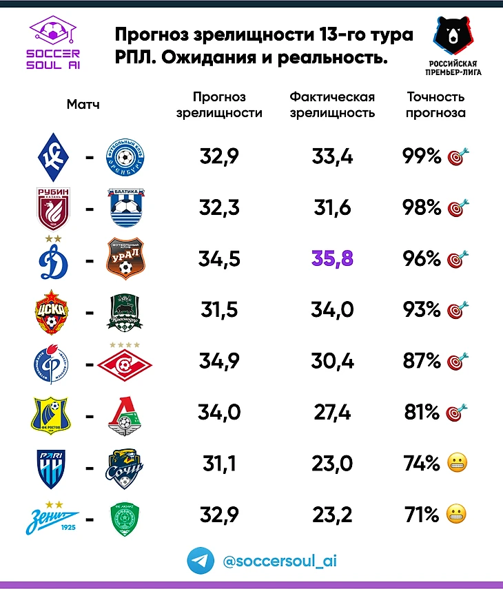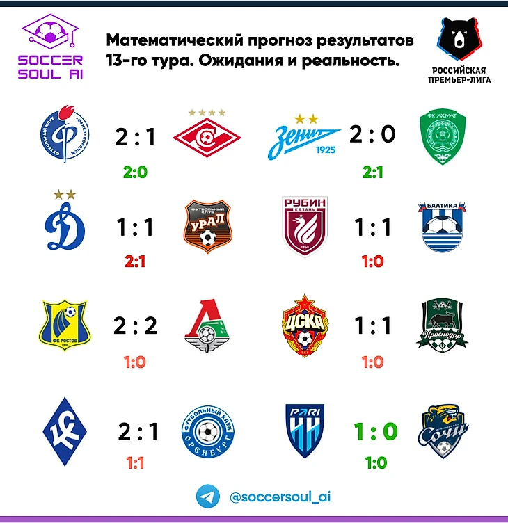 Результаты прогнозирования 13-го тура РПЛ и прогноз на 14 тур