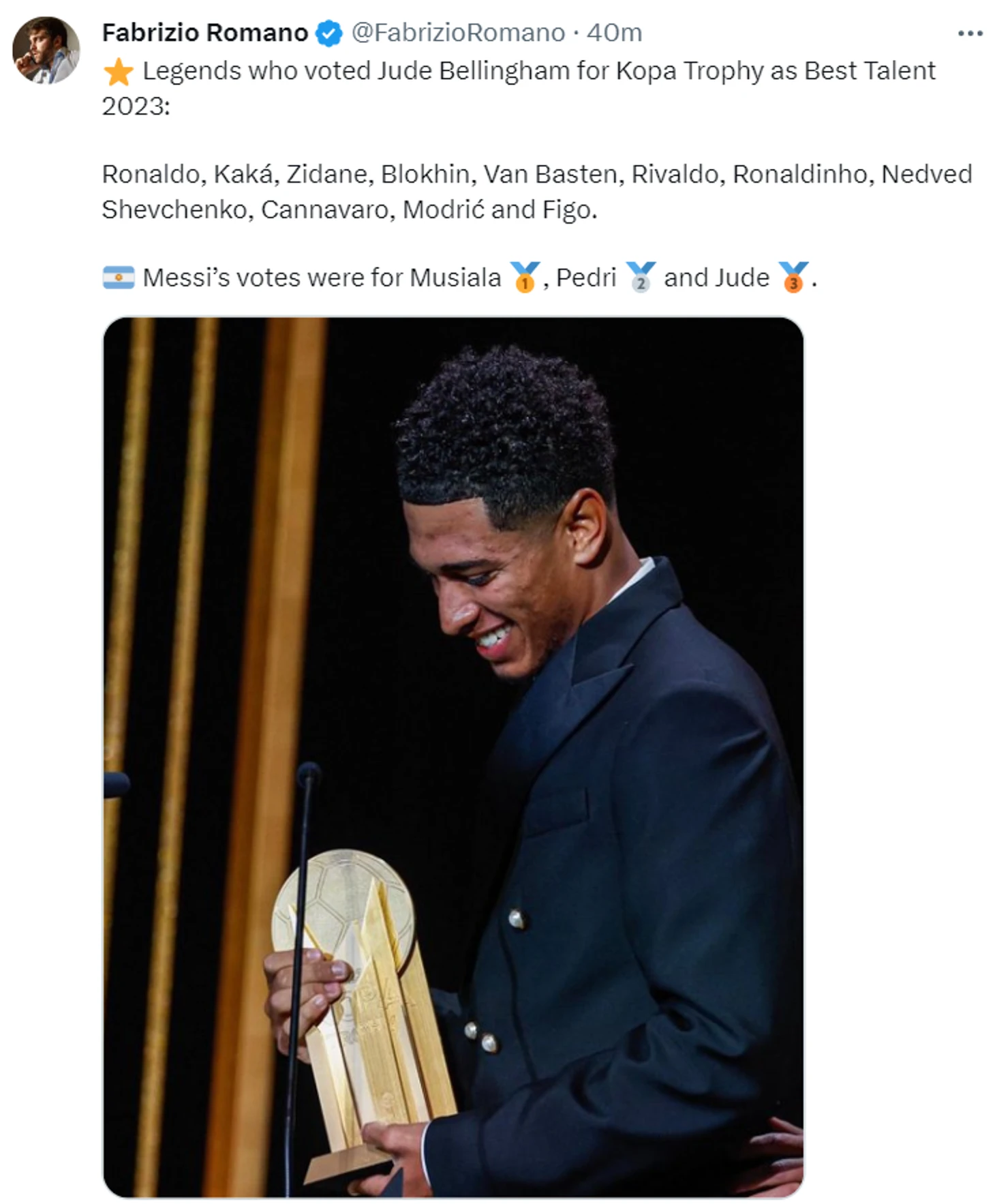 «Легенды, которые проголосовали за Джуда Беллингема в рамках борьбы за Трофей Копа в 2023 году: Роналдо, Кака, Зидан, Блохин, Ван Бастен, Ривалдо, Роналдиньо, Недвед, Шевченко, Каннаваро, Модрич и Фигу».