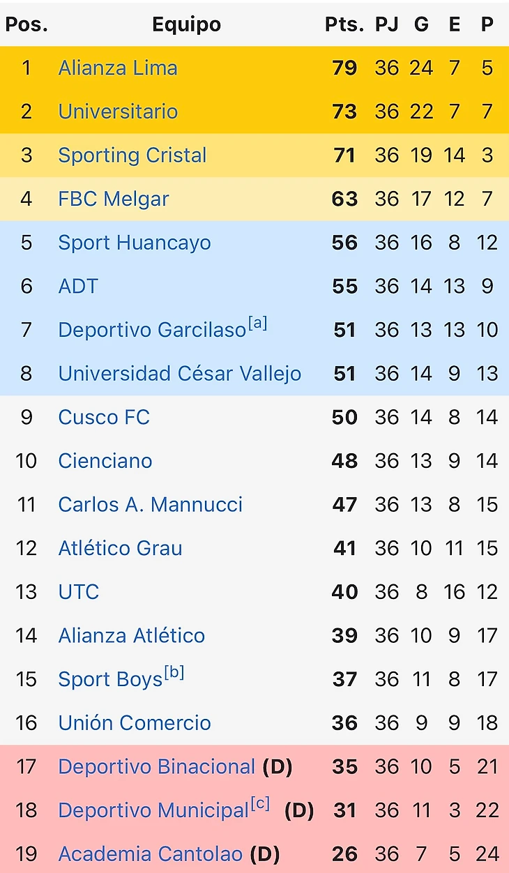 Альянса Лима и Университарио, победители Апертуры и Клаусуры, заняли первое и второе место в общей турнирной таблице и напрямую квалифицировались в суперфинал. Исход перуанского классико определит чемпиона Перу 2023 года.