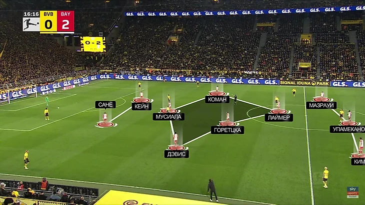 В прессинге «Бавария» тоже использовала схему с тройкой защитников – здесь Сане и Кейн выступали в качестве нападающих: