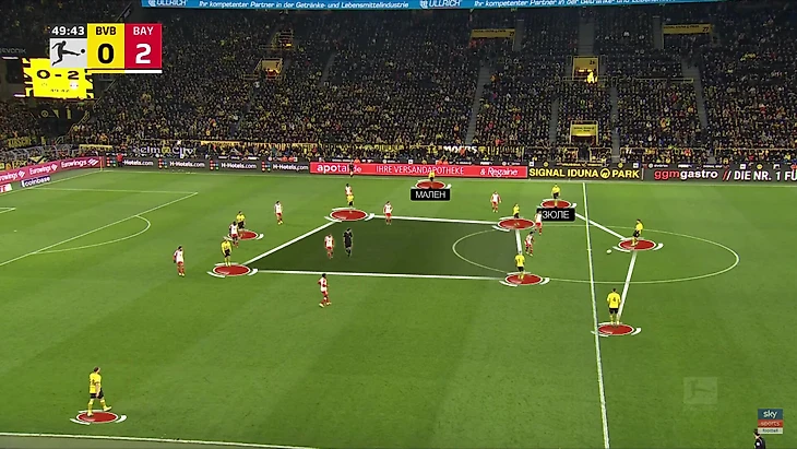 И да: «Бавария» была без Киммиха. В такой конфигурации задушить ее попроще, чем обычно, но «Дортмунд» вместо давления устроил тренировку «Баварии» (квадрат с 2-3 игроками в центре).