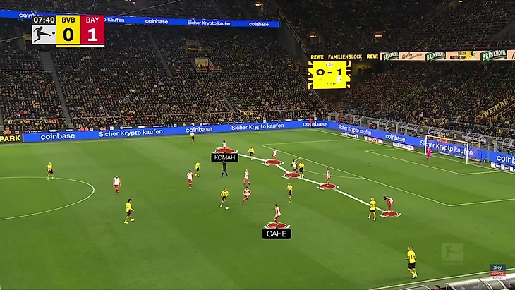 Чтобы сделать контратаки более опасными, Тухель использовал спецприем. При обороне у «Баварии» проявлялась явная ассиметричность флангов. Кингсли Коман садился пятым защитником (либо просто отрабатывал поглубже), а Сане оставался в провокационно высокой позиций. Так конфигурация выглядела незадолго до второго гола: