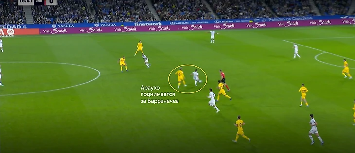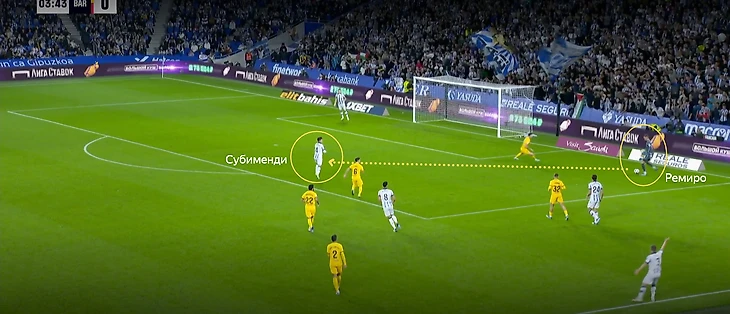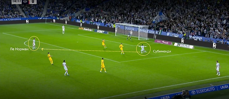 Без мяча Субименди опускался в линию обороны, образуя пятёрку сзади (против атакующей пятёрки «Барселоны»). А центральные защитники часто поднимались за своими оппонентами. В таких эпизодах Субименди страховал партнёров.