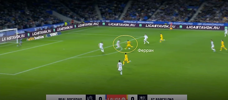 Основной мотив выхода Феррана (наверное) – желание использовать высокую линию обороны соперника. Торрес хорошо открывается за спину и использует свободное пространство. «Реал Сосьедад» позволяет создавать такие ситуации.