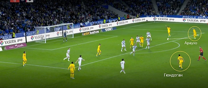 В результате свободу получает Гюндоган. Илкай выполняет передачу в штрафную на набегающего Араухо – гол.