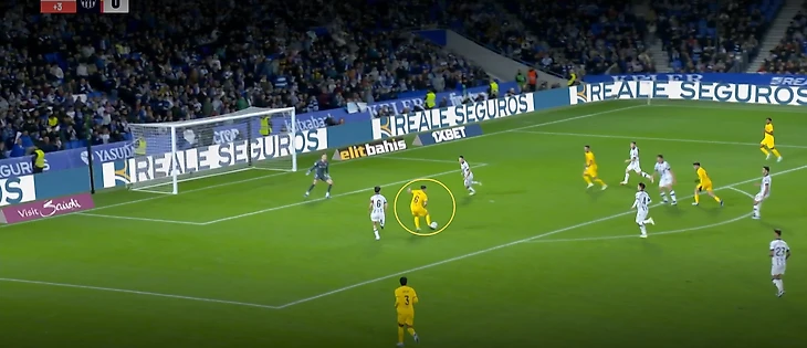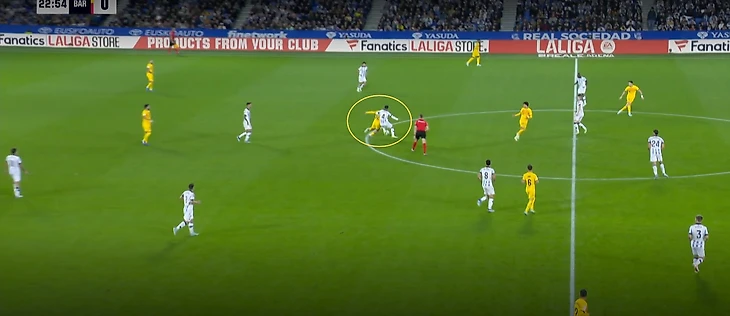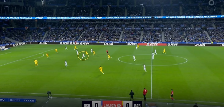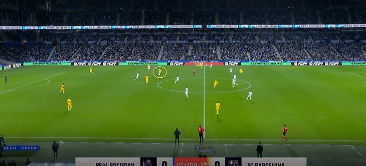 Гол пришёл в следующей ситуации. Атака идёт через правый фланг, блок «Реал Сосьедада» смещается на сторону мяча. Свободу на левом краю получает Бальде, Педри переводит на него мяч.