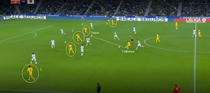 На последних минутах «Барса» создала отличный момент. Рафинья нашёл коридор для передачи на Педри. У каталонцев пятёрка в атакующей линии, из-за чего защита басков была вынуждена разрываться.