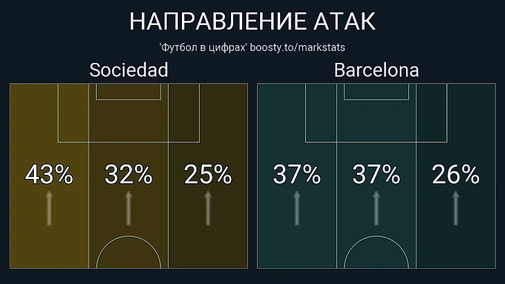 «Барса» сделала всего 393 передачи. Так мало в этом сезоне ещё не было. Это случилось не из-за нежелания команды Хави контролировать мяч, а из-за игры «Реал Сосьедада», стремящегося владеть мячом и высоко прессинговать (PPDA = 7.5). С настолько интенсивным давлением «Барса» ещё не встречалась.