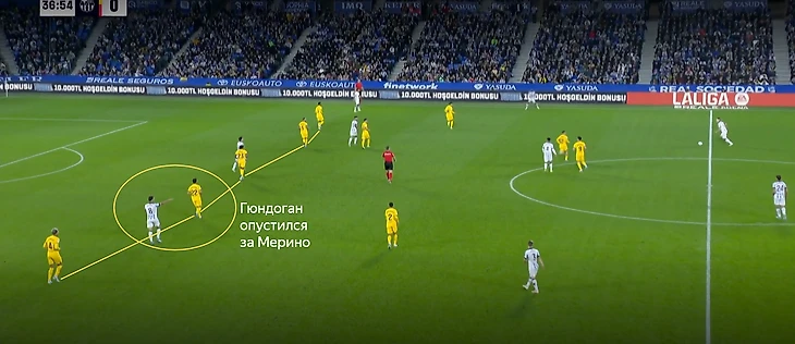 Когда атаковали баски, Мерино часто вынуждал Гюндогана опускаться за ним в оборонительную линию.
