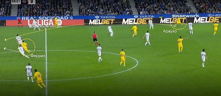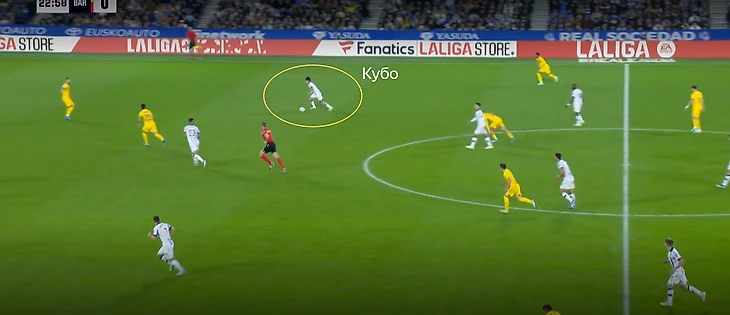 Кубо поднимался к Ойарсабалю, образуя пару в первой линии. Дальше была тройка Барренечеа-Мерино-Браис Мендес. Дальше этот блок смещался в зависимости от положения мяча.