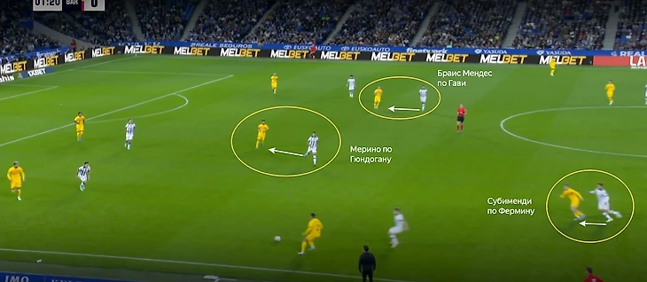 При этом прослеживались персональные ориентировки: Мерино по Гюндогану, Мендес по Гави, Субименди по Фермину.
