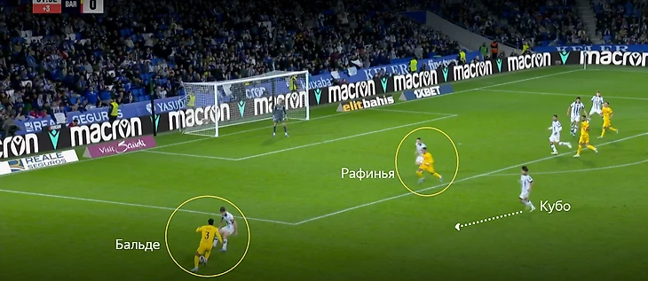 Рафинья рывком уводит защитника, Бальде остаётся один в один против соперника, Кубо вынужден смещаться для подстраховки.