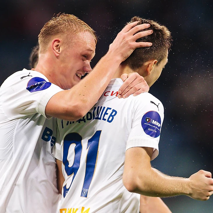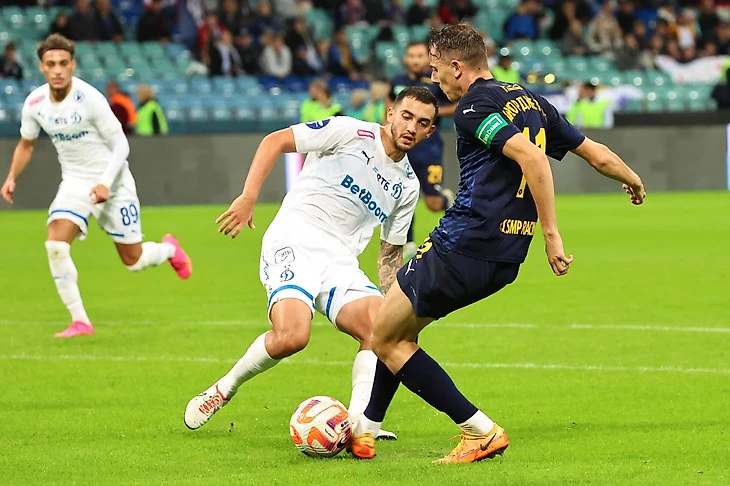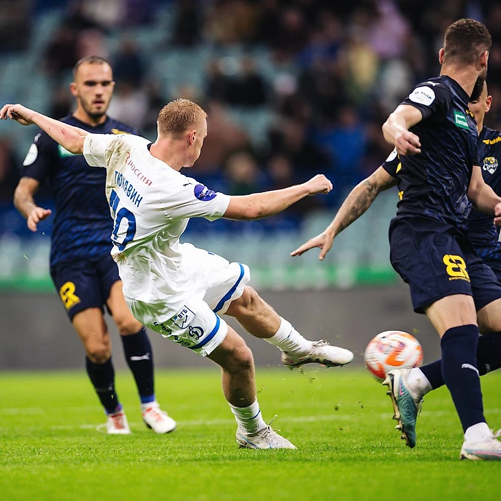 «Динамо» сразу начинает с прострела ворот. Чуть-чуть не хватает «бело-голубым» до завершения атак. И вновь Фёдор Смолов отличается отличной передачей на Константина Тюкавина: мастерство и опыт дают о себе знать.