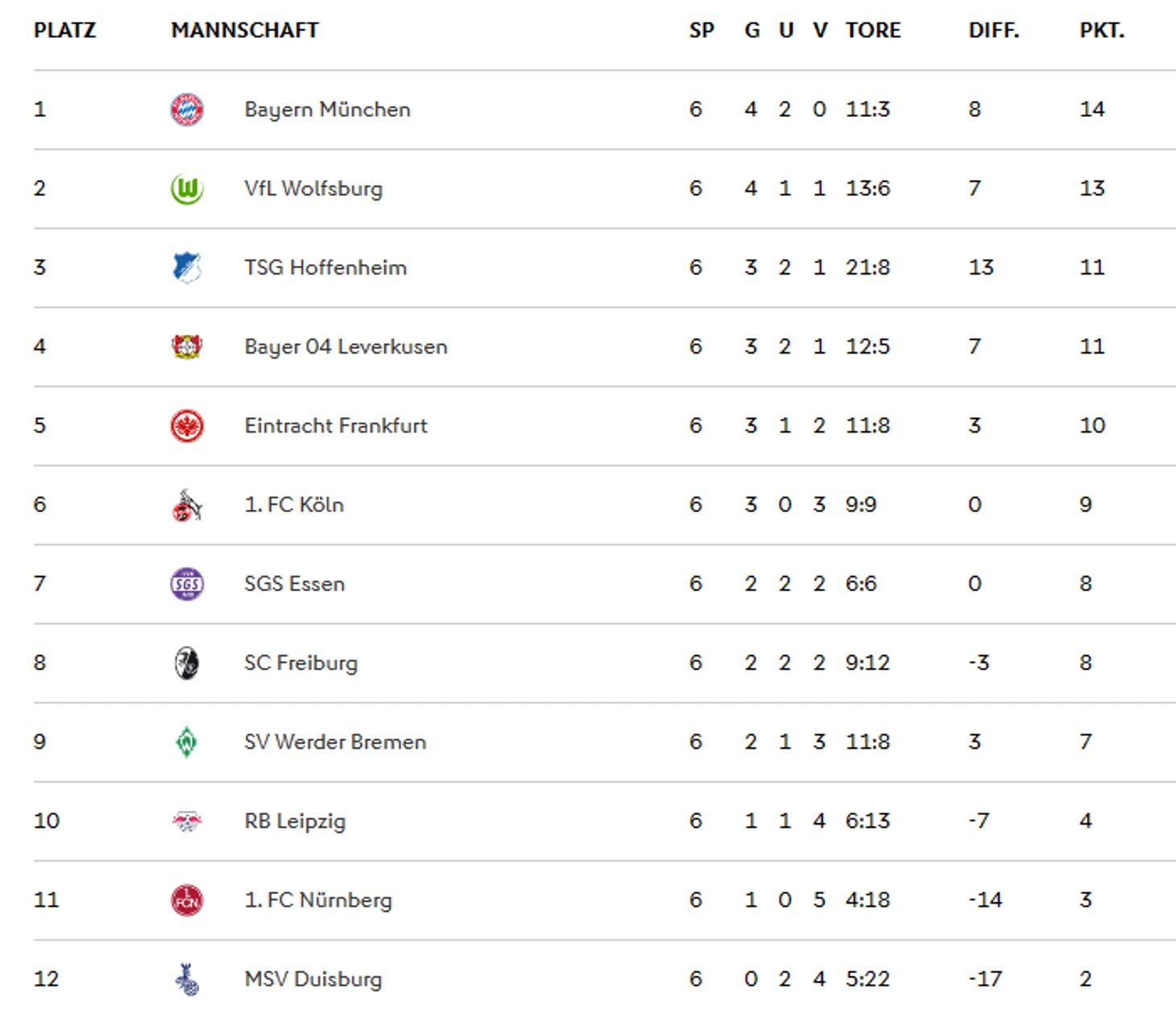 Турнирная таблица женской Бундеслиги после шестого тура: