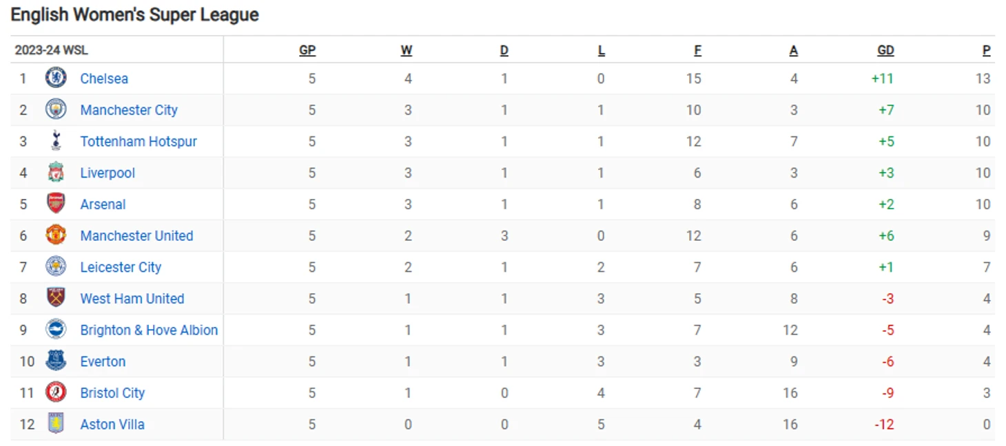 Турнирная таблица женской Суперлиги ФА после пятого тура: