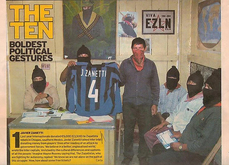 Но самый известный случай с благотворительной деятельностью капитана «Интера» связан с сапатистами – леворадикальным партизанским движением в Мексике. С середины 1980-х в южном мексиканском штате Чьяпас, населенном в основном индейцами майя, возникла организация «Сапатистская армия национального освобождения» (САНО). Ее цель – не только борьба за права местного населения, но и проведение радикальных социальных реформ, основанных на миксе идеологий марксизма и анархизма. Лидером САНО стал субкоманданте Маркос – загадочная личность, скрывающая лицо за балаклавой. Большинство исследователей считают, что его реальное имя Рафаэль Гильен – профессор философии университета UNAM в Мехико.