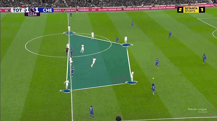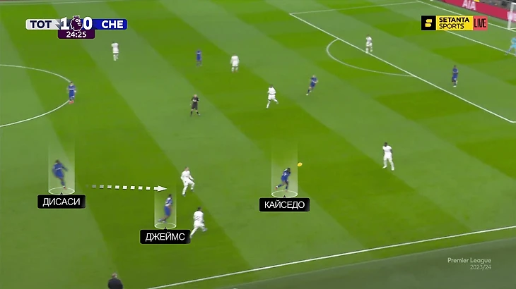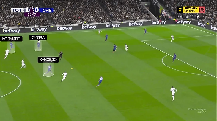 В этот раз оппонентом Мэддисона был Мойсес Кайседо. Поначалу опорник «Челси» не мог определиться. Иногда оставлял Джеймса, иногда шел в давление, но с нарушением правил. В эпизоде с голом «Тоттенхэма» последовал за Мэддисоном, но не смог плотно встретить – в итоге англичанин вскрыл пасом зону, которую оставил Кайседо: