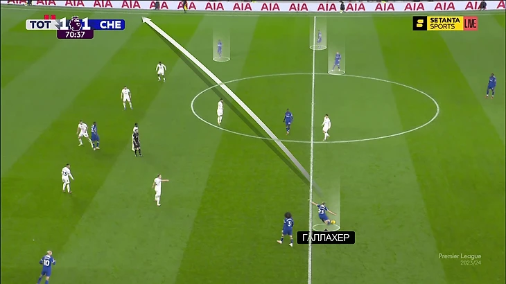 2. Слишком торопились доставить мяч вперед. Камера несколько раз выхватывала Почеттино, который просил готовить заброс, а не просто пулять за спину. Вот характерный пример. Игроки «Челси» еще не готовы, а Конор Галлахер уже хочет веселиться: