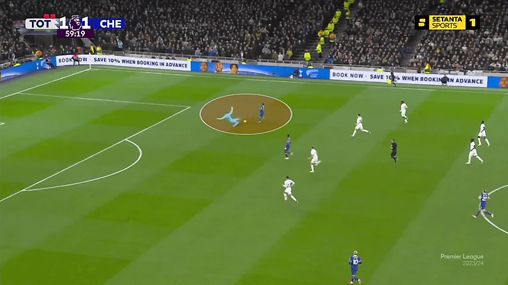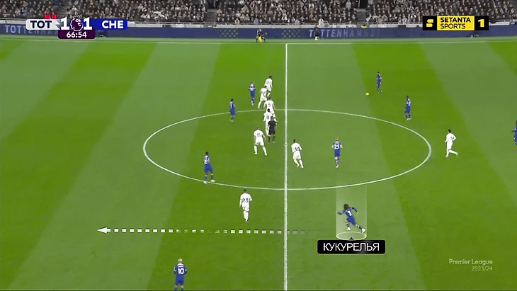 Ход выглядит вдвойне безумным, если учитывать два фактора. Первый – у «Челси» полно игроков, которые хороши на пространстве (Стерлинг + Джексон + Джеймс) и умеют пасовать за спину (Энцо + Палмер). Второй – вообще-то «Тоттенхэм» лишился основной пары центральных защитников. Помимо Ромеро, из-за травмы вылетел и Микки Ван де Вен. Примечательно, что именно после рывка за нападающим «Челси».