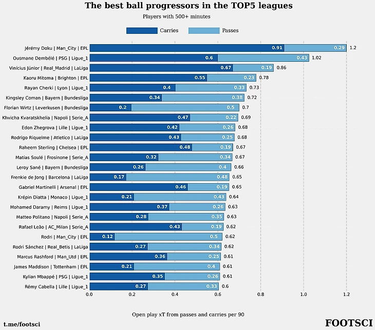 В качестве финальной точки с метрикой xT предлагается рассмотреть актуальные рейтинги лучших футболистов Европы по создаваемой опасности через продвижение мяча.