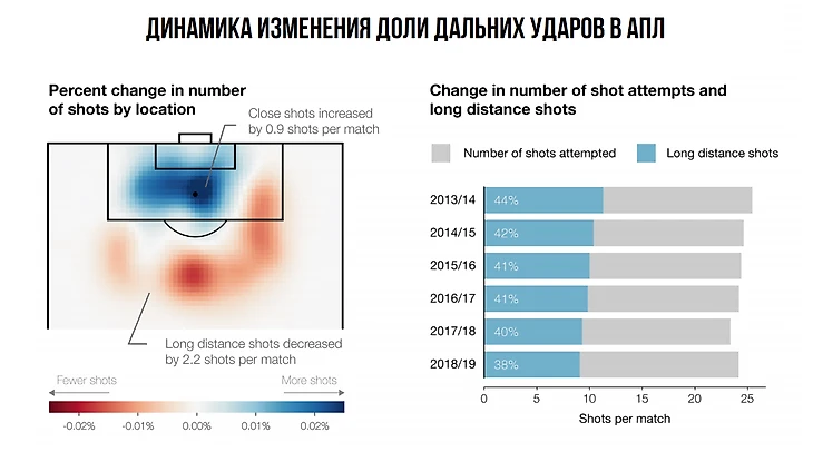 У меня нет данных относительно динамики изменения матрицы от сезона к сезону при накоплении статистики, просто интуитивно кажется, что паттерны ударов и продвижений мяча могут меняться с течением временем. Интуицию могу подкрепить одной из моих старых статей и интересным графиком, на котором видно, как снижается доля ударов с дальней дистанции в АПЛ на протяжении периода в 6 лет. А координаты и статистика ударов напрямую влияют на итоговые значения xT в матрице переходов.
