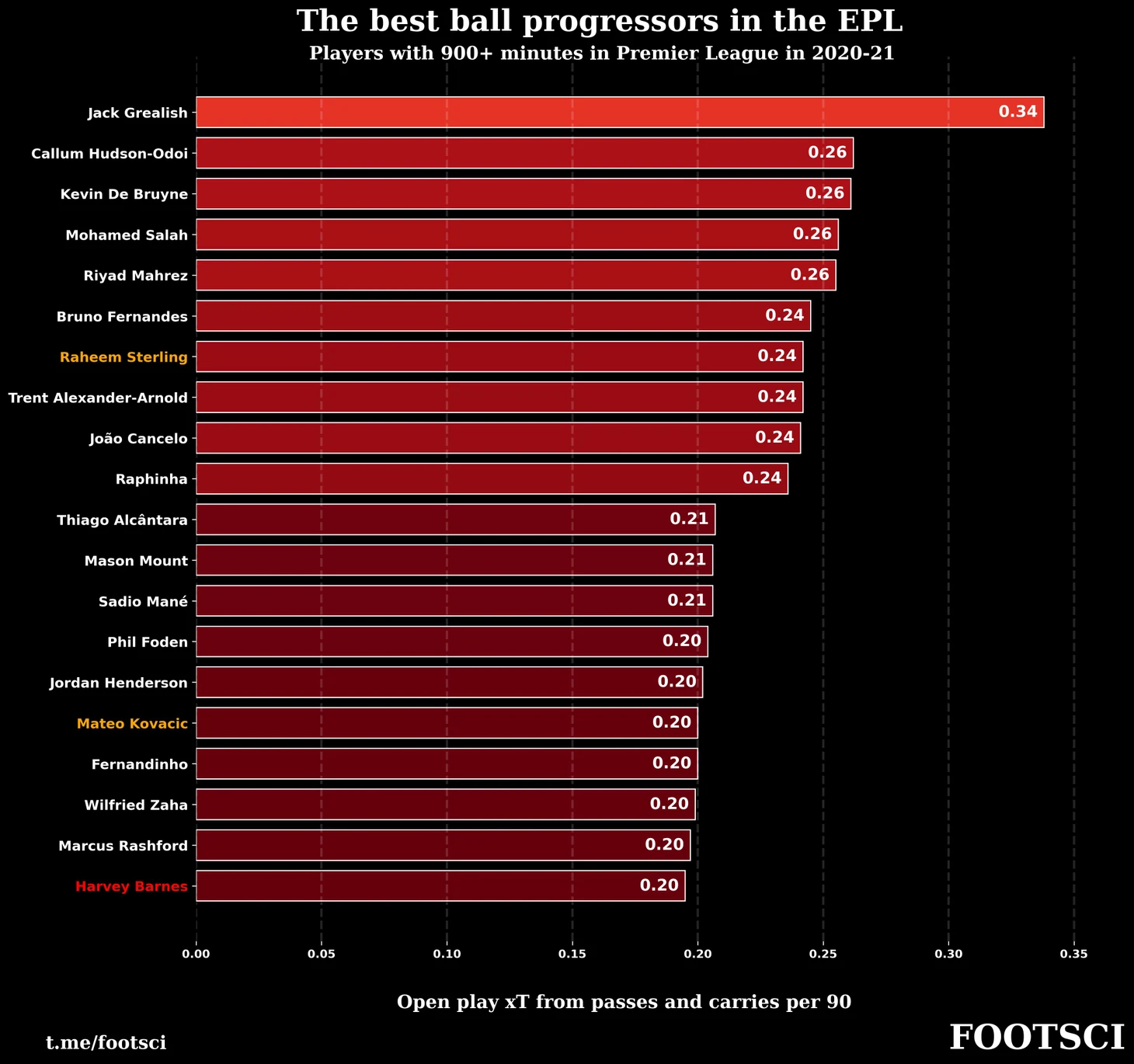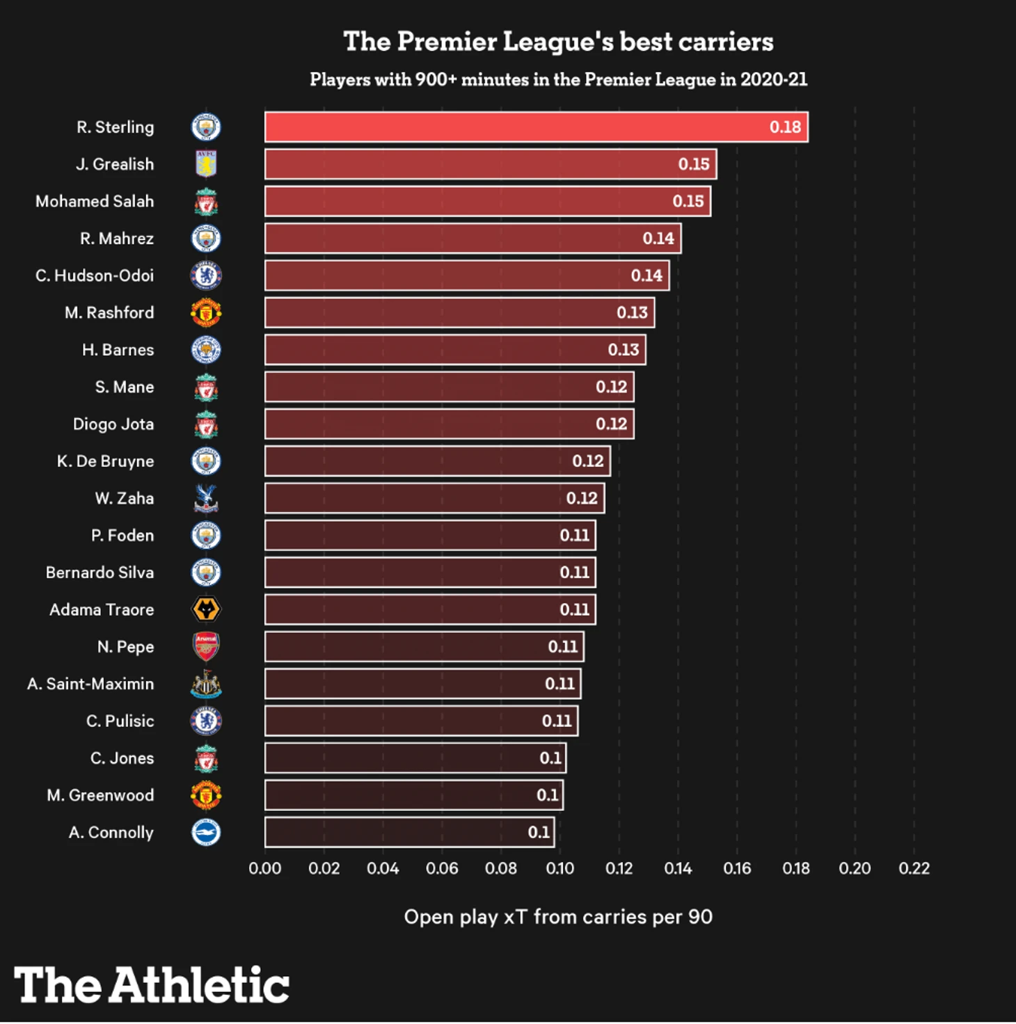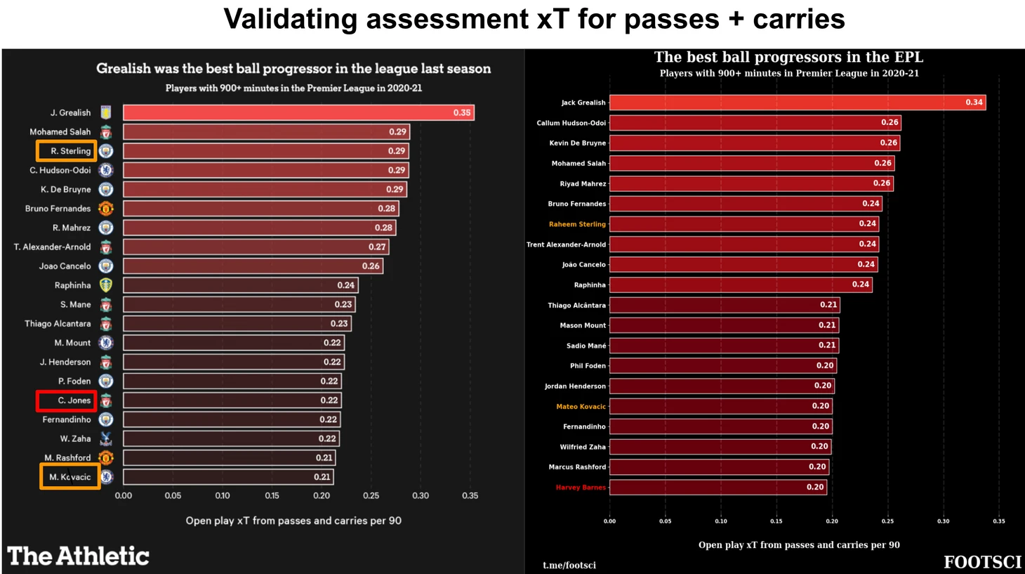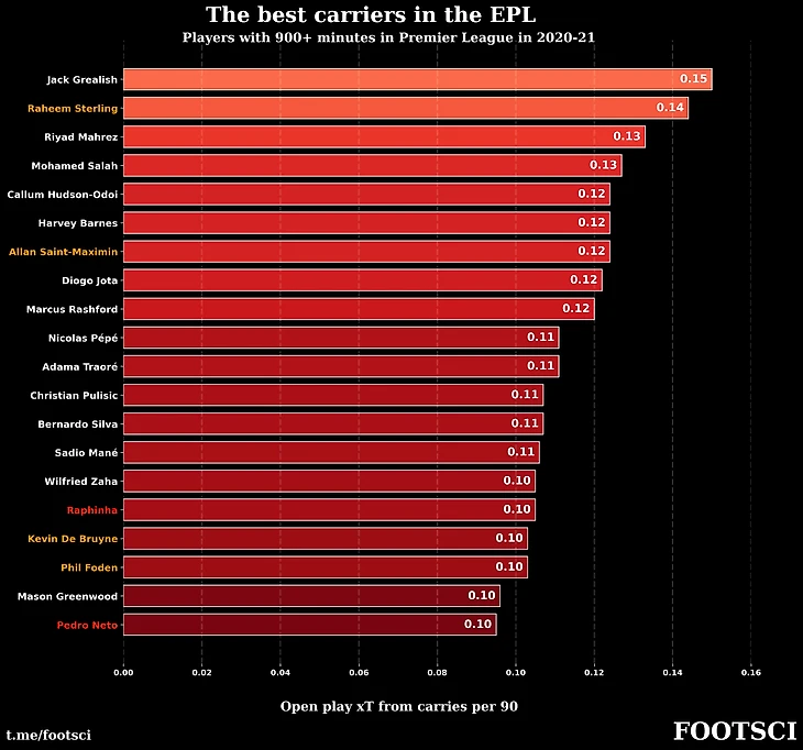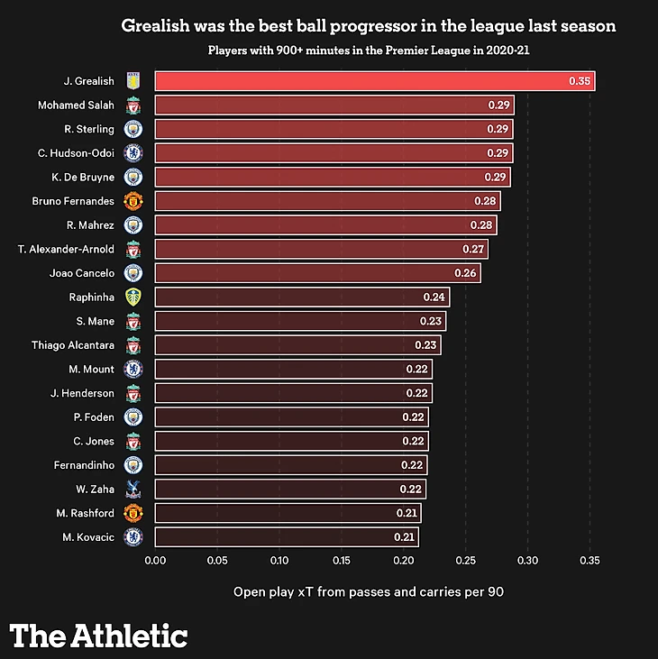 В рейтинге от the Athletic максимальное значение приведенное к 90 минутам у Грилиша равнялось 0.34 xT. Если обновить рейтинг на основе моей матрицы переходов, то Джек получит 0.83 xT.
