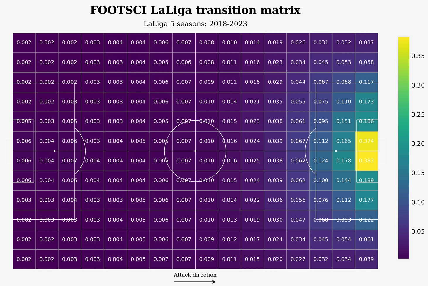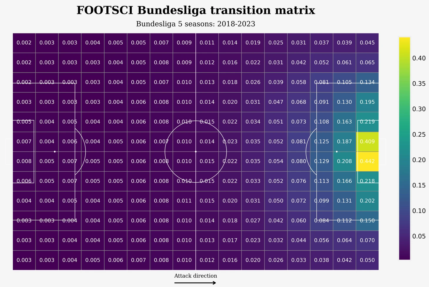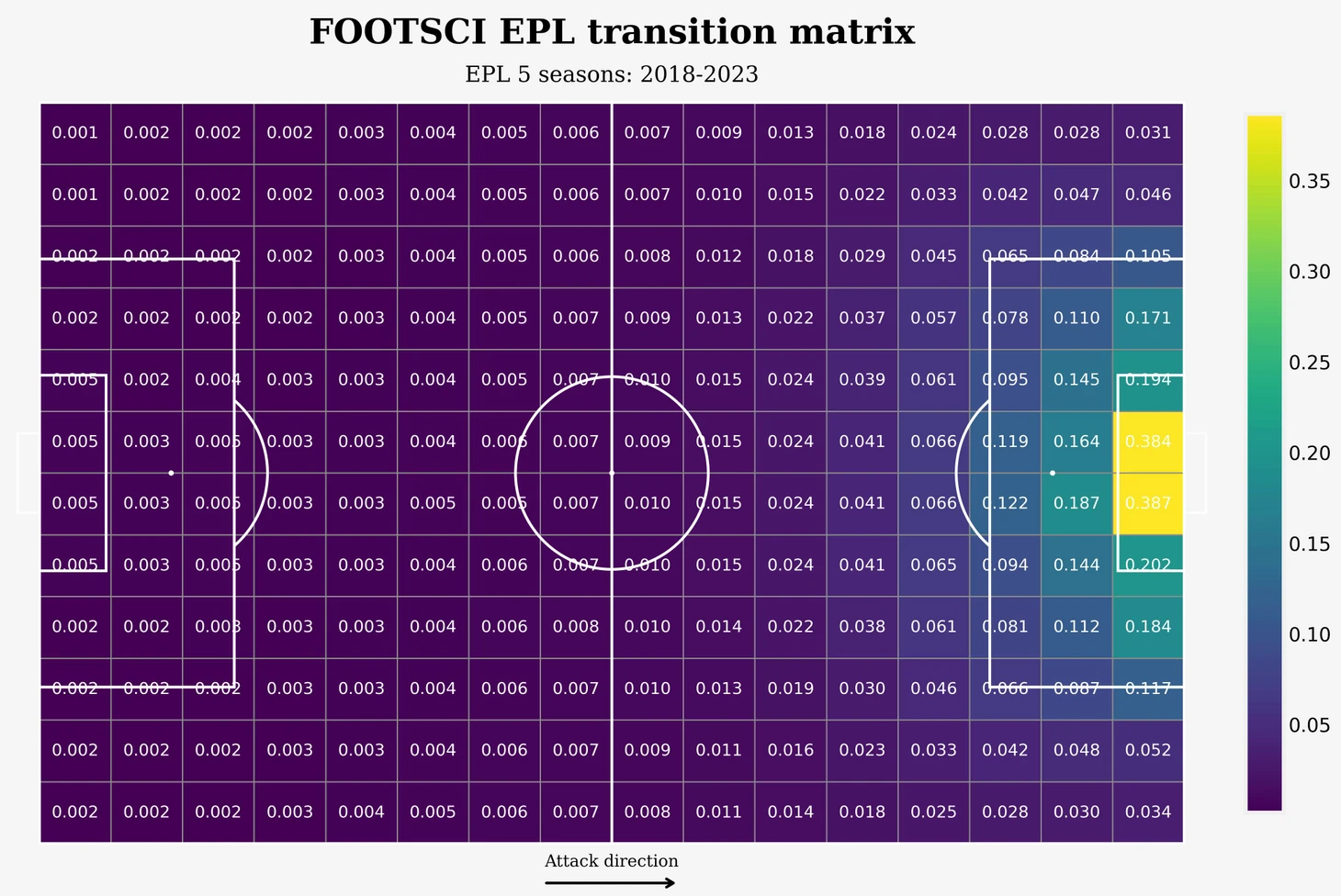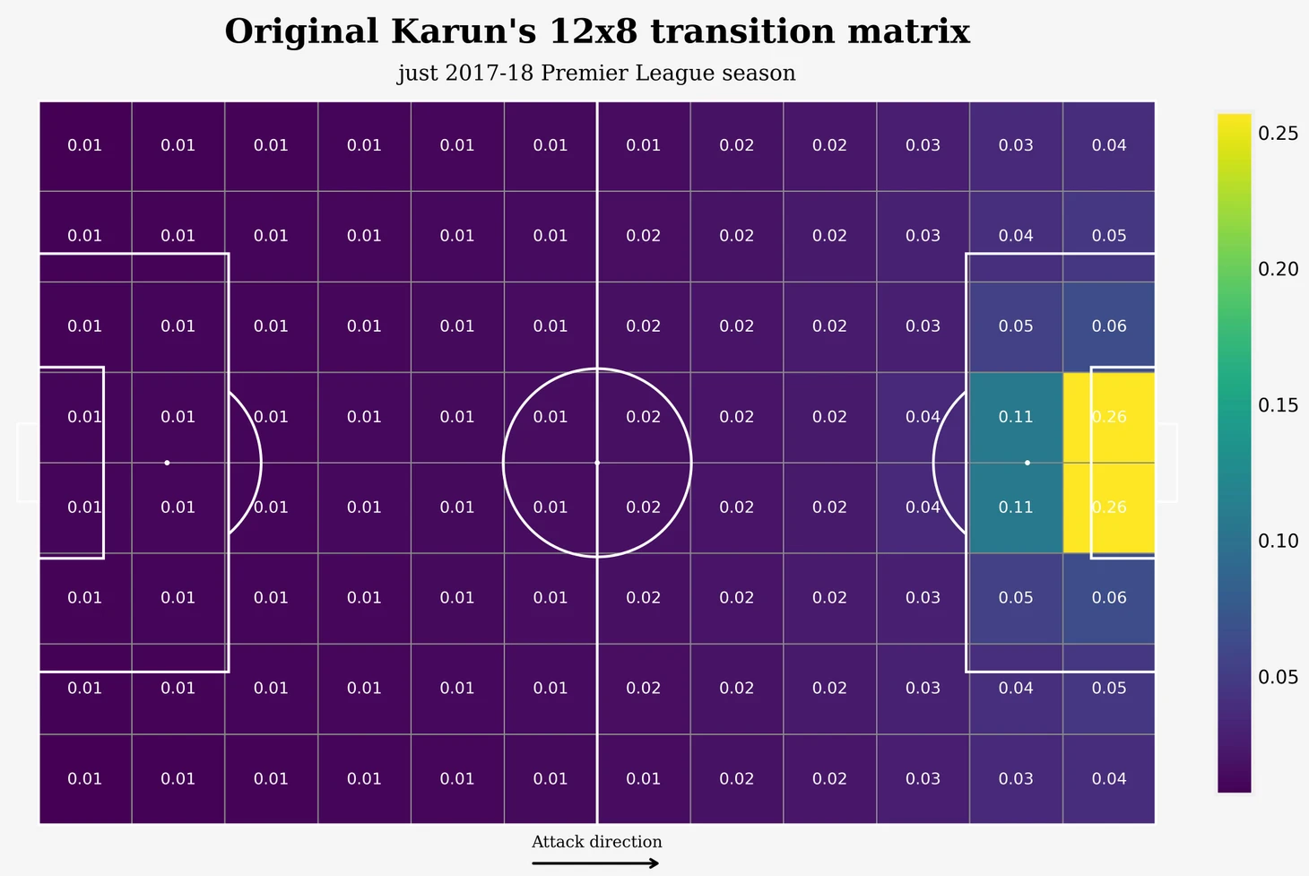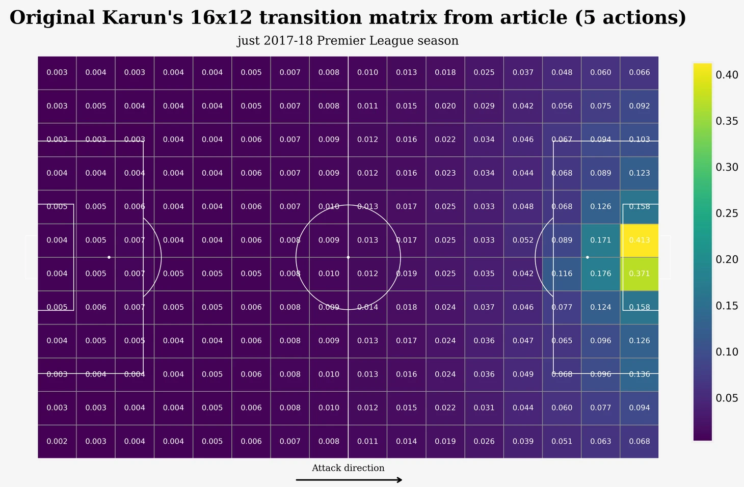 Данная матрица была получена на основе статистики ударов, голов, пасов и продвижений мяча для матчей АПЛ 2017-2018. Каждая клетка матрицы - это значение xT для данной конкретной зоны (или по другому - вероятность забить гол находясь с мячом из каждой конкретной зоны через несколько последующих действий). (Затрудняюсь сказать наверняка, сколько здесь было учтено действий, сам автор не привел дополнительных комментариев, но обычно используется 4-5).