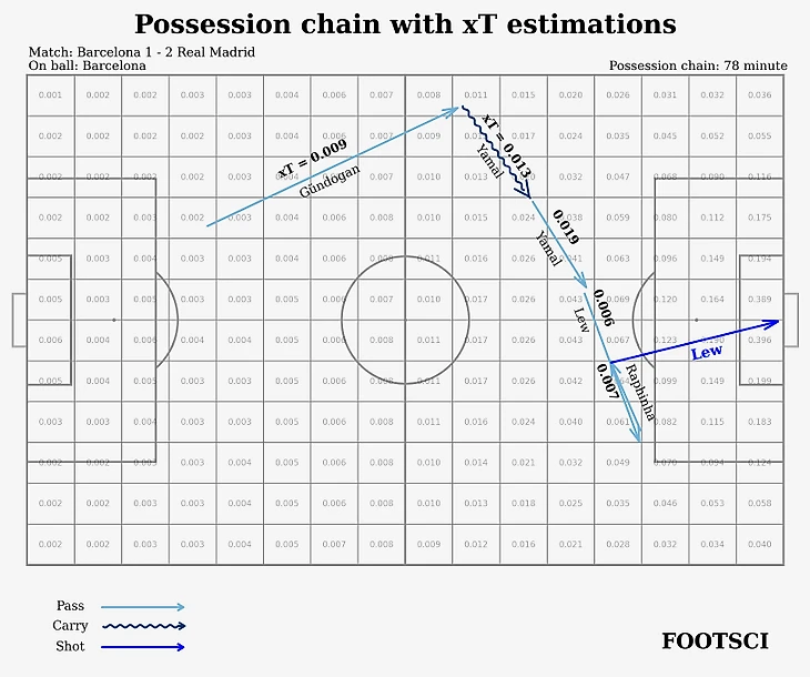 Представленная цепочка состоит из 6 событий: передача Гюндогана на Ямаля, продвижение с мячом (carry) и последующий пас испанца на Левандовского, передача Роберта на Рафинью, обратный пас на поляка и удар. Всем игрокам, которые участвовали в данном владении, присваивается значение xG последнего удара = 0.03.