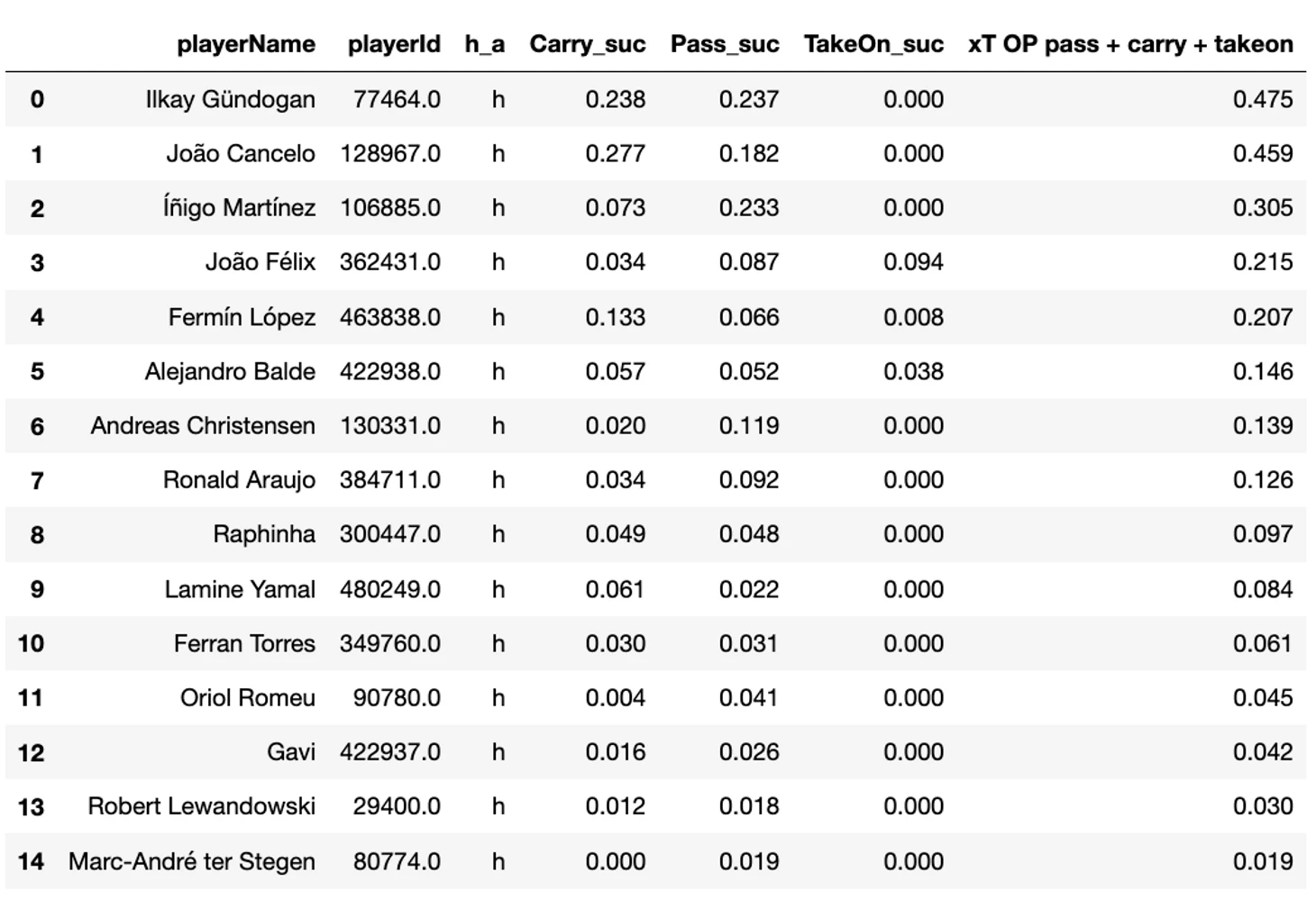 В таблице ниже отсортированы все футболисты Барселоны с суммарными значениями за матч по метрике xT для трех типов действий, продвигающих мяч (передачи, продвижение и обыгрыши).
