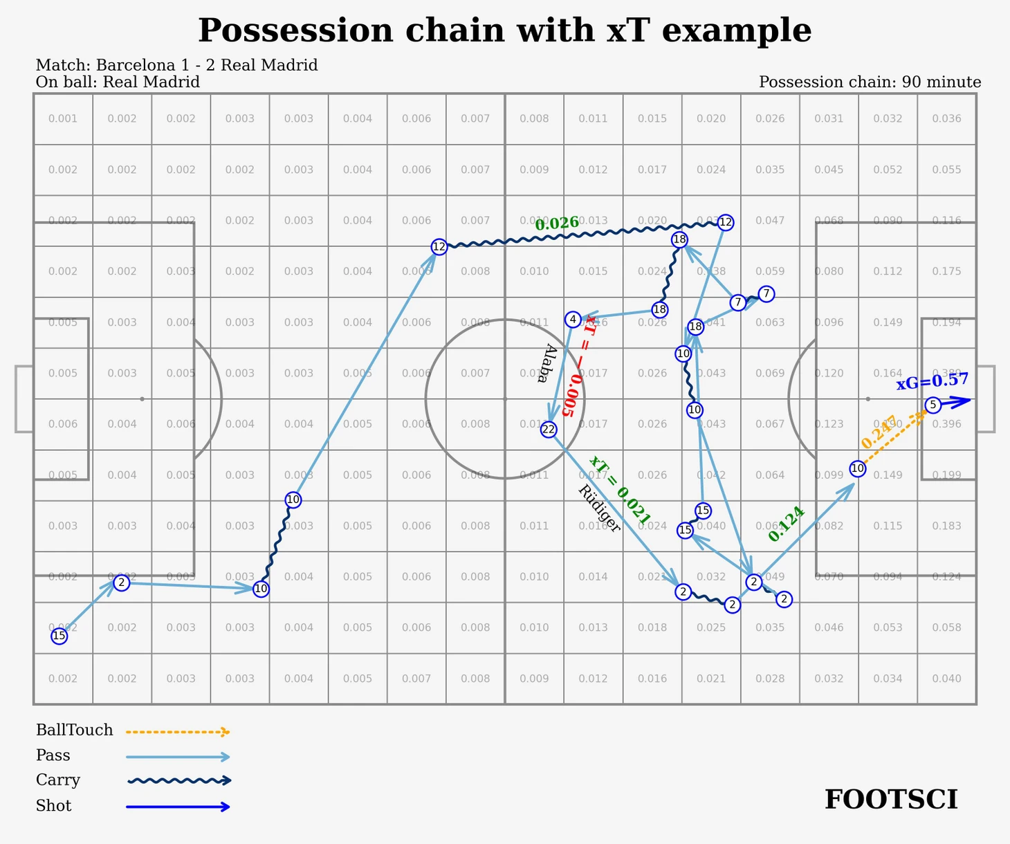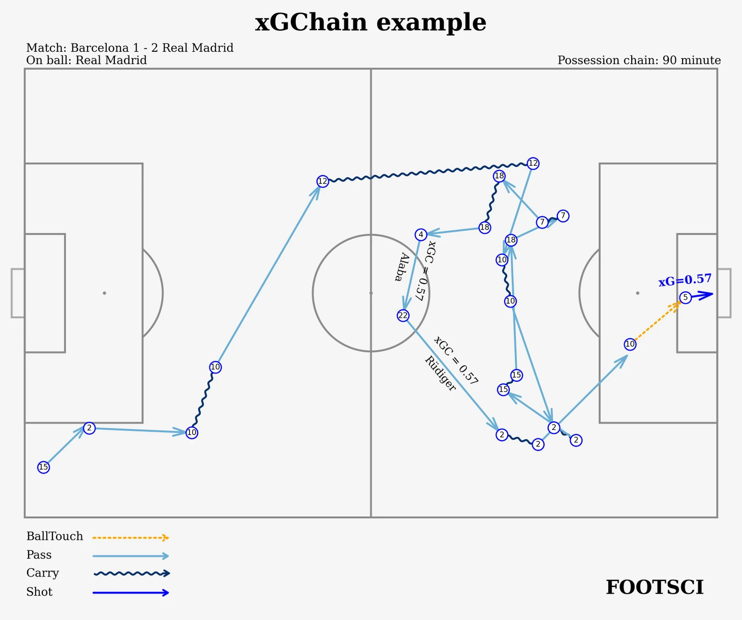 В рамках рассмотренного владения Реал совершил 13 передач и одно голевое касание мяча Модричем (BallTouch), которое по сути также является передачей. В данной цепочке было задействовано 9 человек, каждый из которых получил xGChain = 0.57.