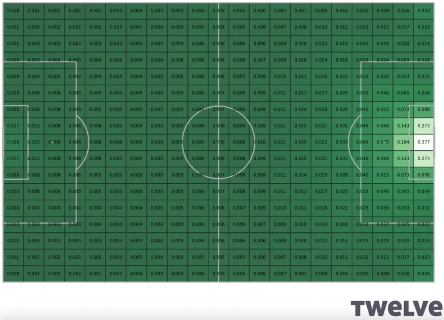 Если вы сравните схожие области на матрице от первого автора и матрице от twelve, то вы увидите, что в последней ячейки имеют более низкие значения. Также еще раз можно обратить внимание, что повышение гранулярности приводит к тому, что ячейка из предыдущего примера внутри штрафной площади со значением 0.176 для матрицы (5 действий) распадается на две ячейки на матрице от twelve (0.068 и 0.0143) и новая получаемая оценка приращения xT при передаче от углового флага может варьироваться в 2 раза, в зависимости от того, в какую из двух более гранулярных зон попадут координаты паса.